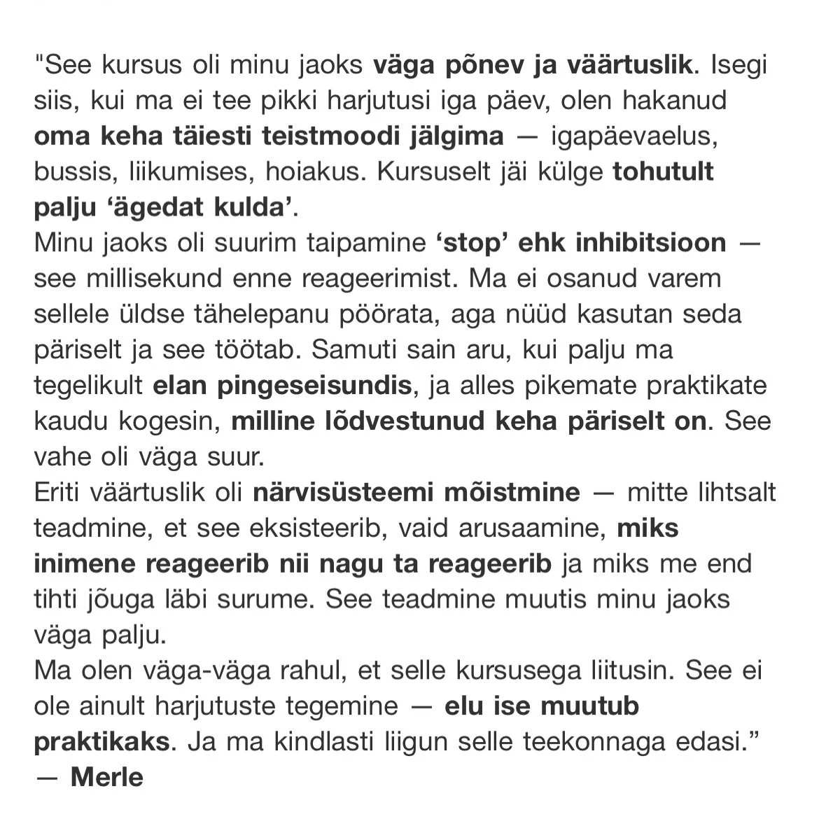 Tänaseks on minu juhendamisel on tuhanded naised õppinud, kuidas läbi kohalolu-ja kehateadlikkuse praktikate oma närvisüsteemi reguleerida, et olla enda vastu lahkem, tunda end oma kehas taas turvaliselt, särada läbi kannatuse, jääda kaose keskel keskmesse, teha ennasthoidvaid valikuid ja liikuda sügavama enesekindluse- ja usalduse suunas.